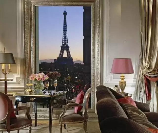 從這個(gè)五星級酒店豪華套房里,你可以以完美角度欣賞到艾菲爾鐵塔。