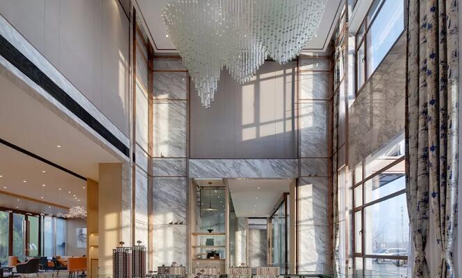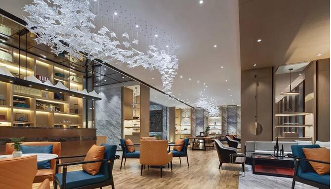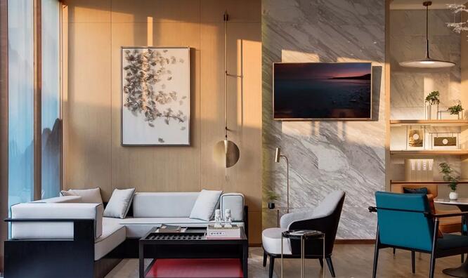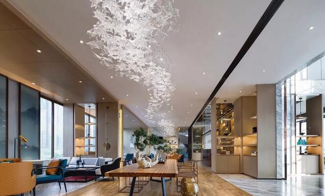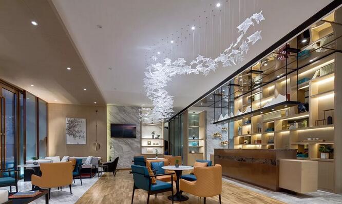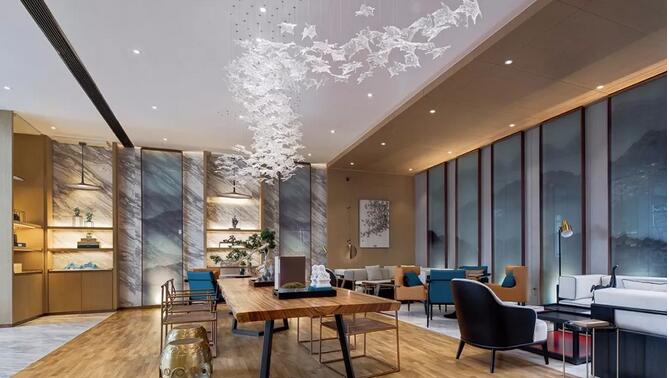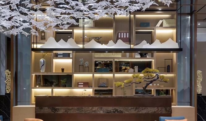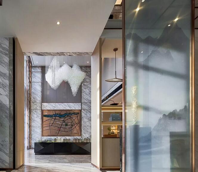 “夫畫道之中,水墨最為上。肇自然之性,成造化之功?!钡袼堋澳琛币詾V盡色彩剔透琉璃為墨,飽蘸筆觸,起承轉(zhuǎn)合,縱橫貫穿于洽談區(qū),成了空間最純粹的風景。
