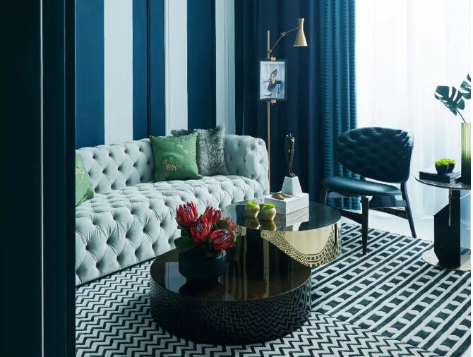 VIP室運用了大量的幾何元素,藍色線條的壁紙與地毯的紋飾相呼應(yīng),無論是墻板上的精致雕花,還是拉扣沙發(fā)的復古優(yōu)雅,都將美感注入到每一處細節(jié)當中。
