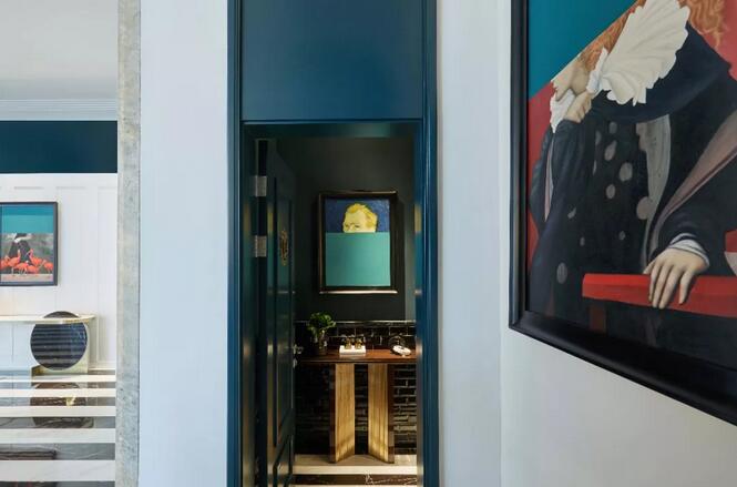 化妝間的設(shè)計,延續(xù)了機械美學的線條構(gòu)造,畫中少女的驚鴻一瞥仿佛攝取了觀畫者的靈魂,色彩上強調(diào)強烈的藍與黑,金色為撞色來點睛,彰顯了空間的戲劇特征。