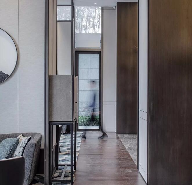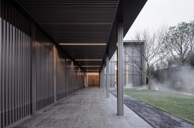 此次改造的重點(diǎn),一是入口,二是內(nèi)部平面功能的重新設(shè)定。樸悅希望整個(gè)銷售中心的改造能與外界形成一種反差,以不同的場景營造形成有趣的體驗(yàn)。整個(gè)售樓處鬧中取靜,幽靜的內(nèi)院獨(dú)享一片城市的寧靜?;谶@個(gè)優(yōu)勢,設(shè)計(jì)師將原正面入口移至左側(cè),并在內(nèi)庭改建了一處廊道,以序列感排列的木格柵構(gòu)建,溫暖靜謐、平靜中帶來舒緩的節(jié)奏,以此形成步入的初始印象。