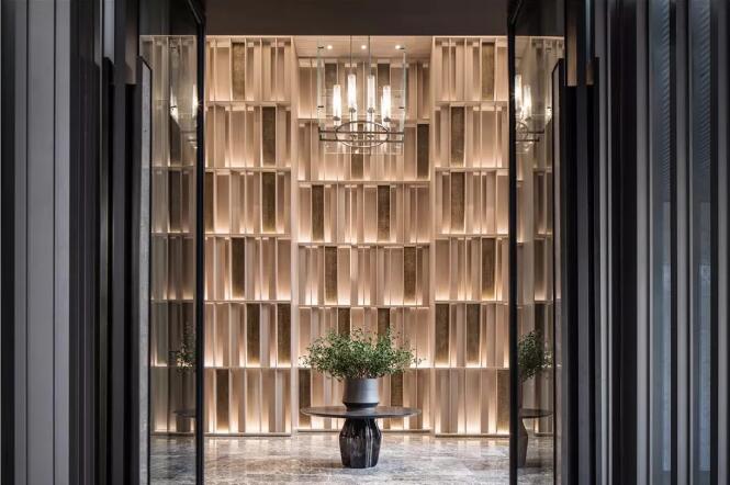 推門進(jìn)入,首先步入眼簾的是前廳。淺木色木質(zhì)格柵自上而下充斥整個(gè)8米層高空間,建筑元素織就的前廳展現(xiàn)了自然的親切和溫暖,加之兩側(cè)與頂燈的渲染,與外部形成了視覺上的差異,令人震撼。肅然進(jìn)入,行至位于對立面凹檻處的接待臺,半遮掩狀態(tài)的圓形導(dǎo)臺被裹挾式藏以身后,僅以灰色墻紙和深色大理石裝飾,藏而不露更添幾分神秘。
