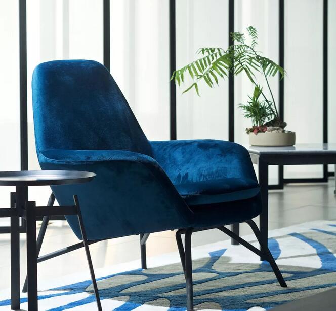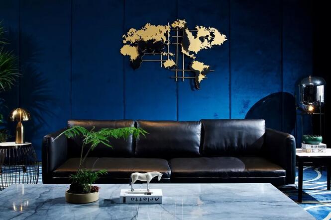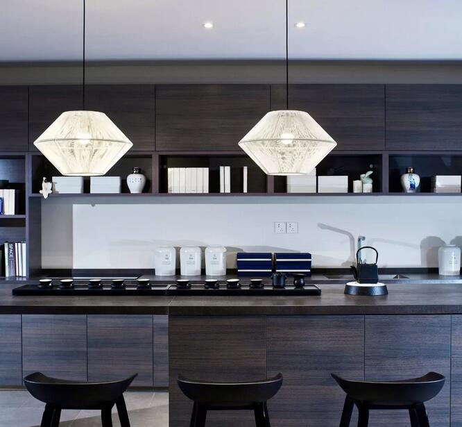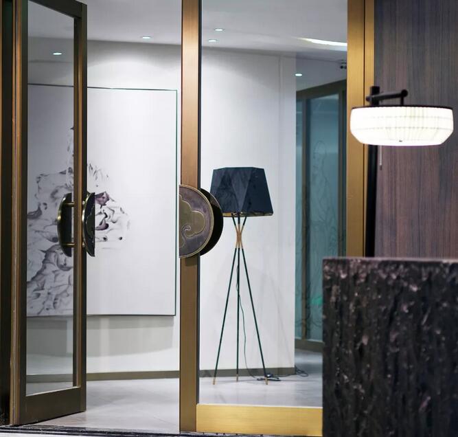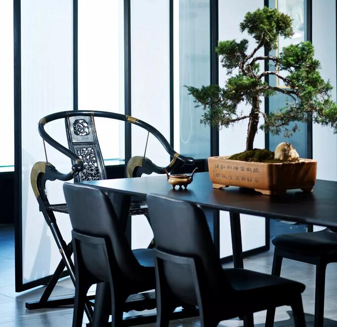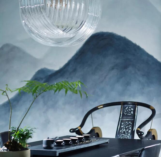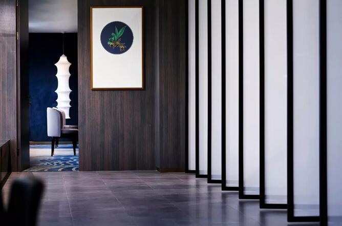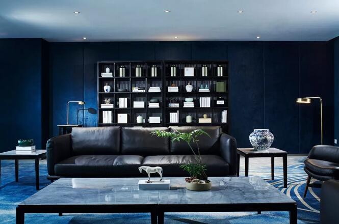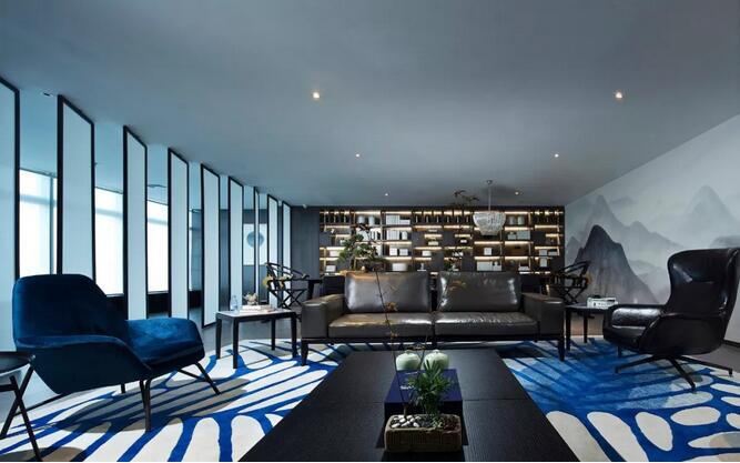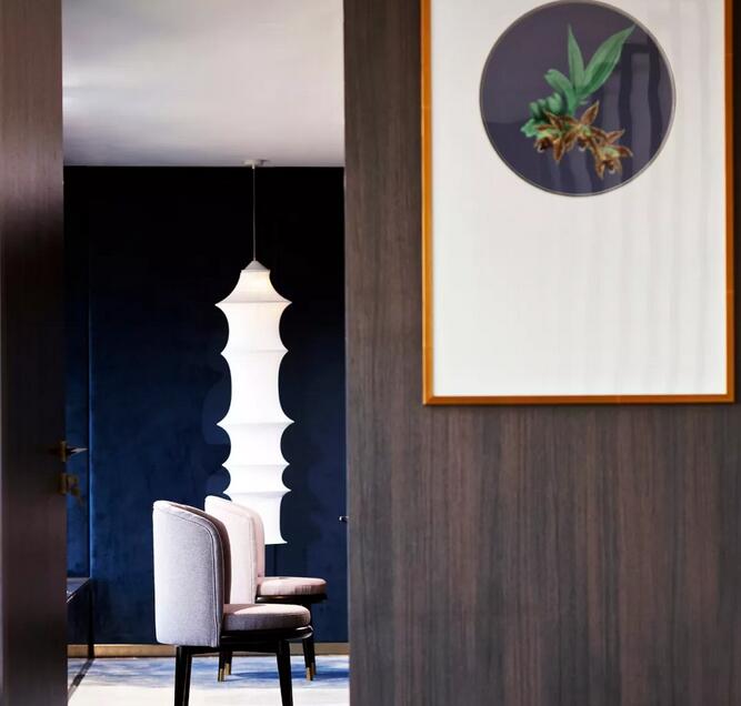 中式元素跟摩登的這種碰撞很奇妙,你可能會(huì)覺得這兩個(gè)風(fēng)格不想(相)干,但是在兩位設(shè)計(jì)師看來卻是十分和諧。簡(jiǎn)潔大氣的設(shè)計(jì)框架中點(diǎn)綴中國(guó)古典山水之意蘊(yùn)。休閑區(qū)沙發(fā)上的藍(lán)色絲絨,仿佛也是空間故事的起承轉(zhuǎn)合。