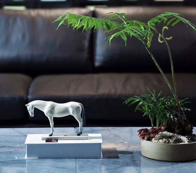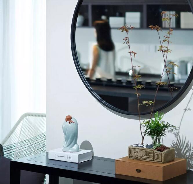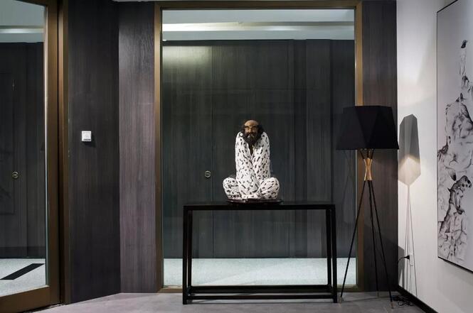 透過入口玻璃窺探,一幅太湖石畫映入眼簾,千古名石肌理由蒙古黑燒制而成,引園林意境入室。達(dá)摩的雕塑隱喻了當(dāng)下語境中禪意美學(xué)的回歸。