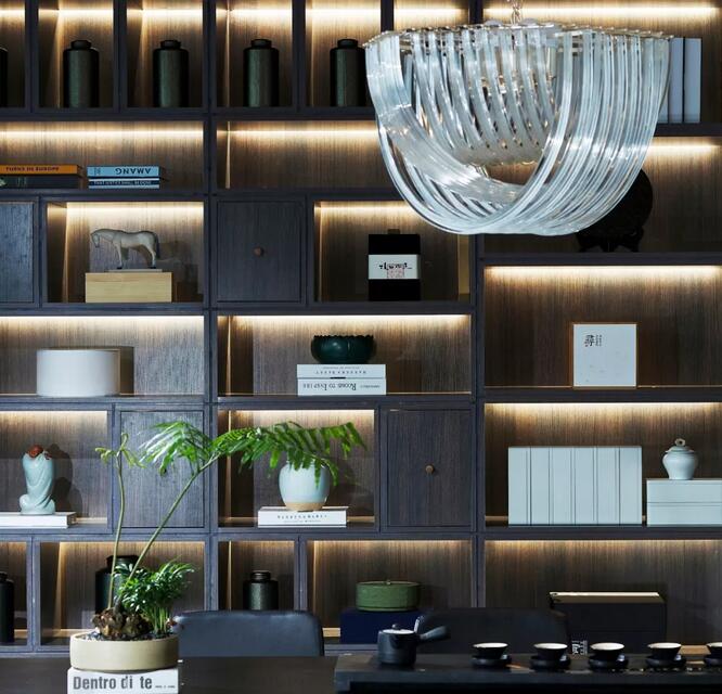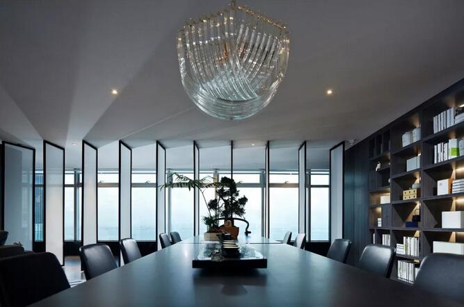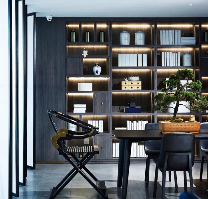 休閑區(qū)內(nèi),一株松柏透出骨子里濃濃的文人趣味,屏風(fēng)之后又是海納百川的廣闊胸懷??臻g中的新中式書架以及皮質(zhì)沙發(fā)通常服務(wù)于成功男性,設(shè)計(jì)師將傳統(tǒng)交椅的小尺度改為大比例,為舒適加分,觀賞海景的同時(shí)帶來君臨天下的會(huì)談體驗(yàn)。