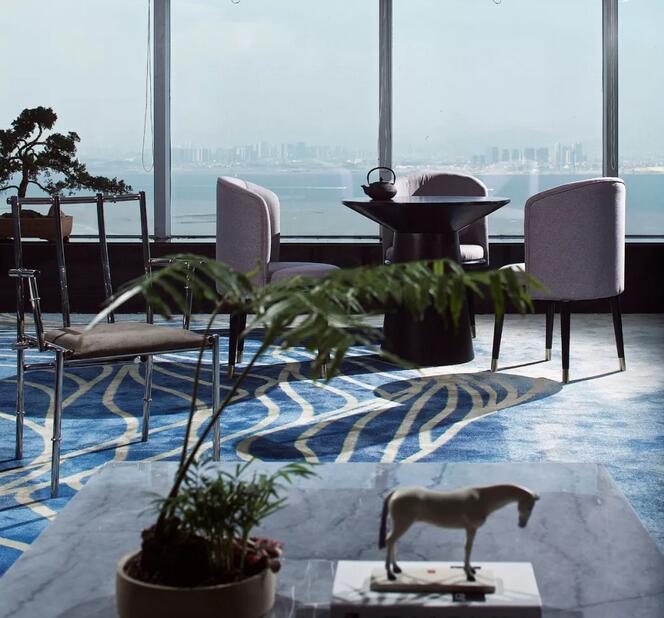 男賓VIP區(qū)可享受廈門當(dāng)?shù)氐钠凡柚?。定制地毯呈寫意黑灰色線條,與屋頂燈飾遙相呼應(yīng),形成體系。