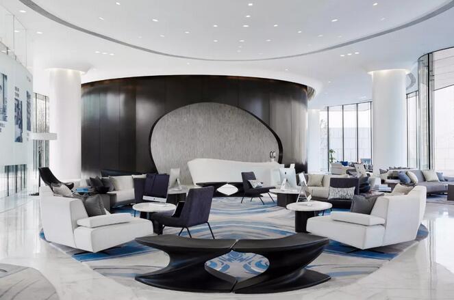接待大廳是人進(jìn)入室內(nèi)的第一感觀,是形成整個(gè)空間氣質(zhì)的起點(diǎn),作為一個(gè)以展示為主的區(qū)域,流線型的頂部設(shè)計(jì),和強(qiáng)烈造型感的空間結(jié)構(gòu),已經(jīng)極具視覺沖擊力,在此區(qū)域,我們摒棄多余的陳設(shè),讓位于空間本身形成的氣場(chǎng),選擇了以極具現(xiàn)代感、流線形態(tài)的藝術(shù)裝置去迎合空間本身的流動(dòng),豐富層次,打破此類空間可能帶來(lái)的壓迫感和疏離感。在空間與人之間制造模糊地帶,形成連接。