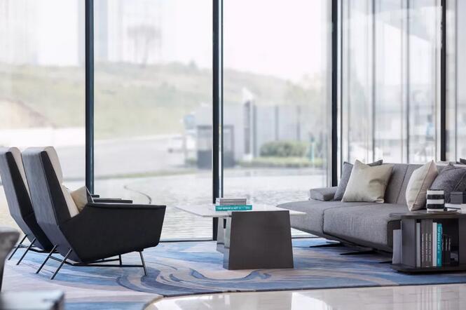 圍合的沙發(fā)不規(guī)則的幾何線條,卻不顯剛硬,面料的質(zhì)感柔化了它的棱角,Arketipo單椅簡(jiǎn)潔流暢的線條,與金屬切割的茶幾,亦在沖突中和諧。