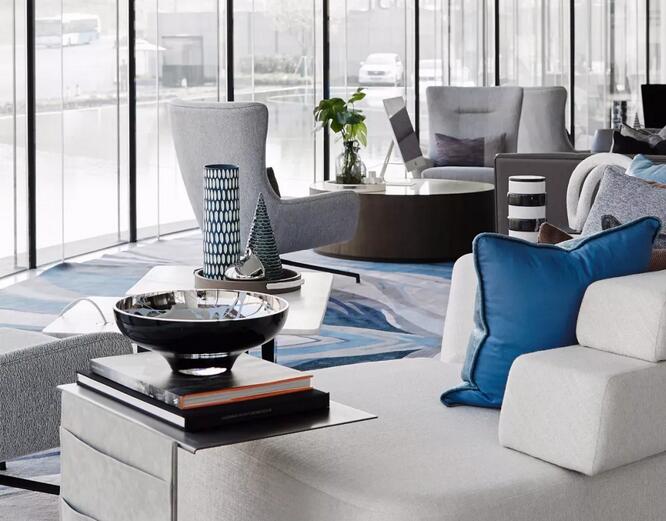 地毯上不同層次的灰藍(lán)色,豐富空間的同時(shí),不破壞空間的整體性,在強(qiáng)調(diào)現(xiàn)代感,藝術(shù)感的同時(shí),我們也更多的保留舒適。