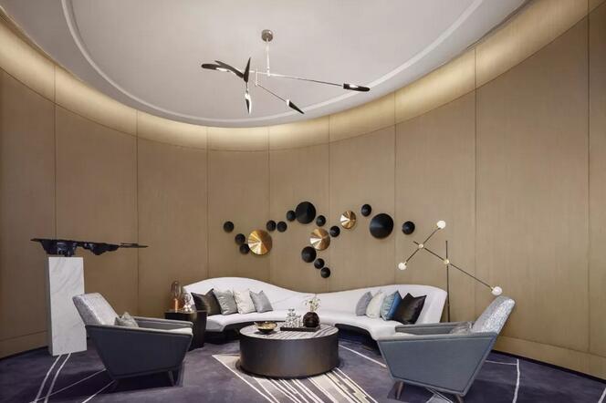 在此區(qū)域,我們通過(guò)串聯(lián)穩(wěn)定面,制造流線,來(lái)回溯空間已經(jīng)形成的氣場(chǎng)。此外,除了弧形分割的區(qū)域,和迎合空間的、具有流線感和造型感的藝術(shù)裝置和家具,我們還適當(dāng)加入一些直朗線條的家具,曲直有度,加強(qiáng)空間的節(jié)奏感。選用真皮,高品質(zhì)麻料,高密度色織肌理面料等,加強(qiáng)材質(zhì)的對(duì)比。