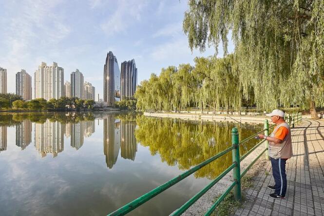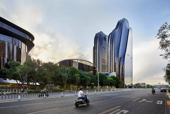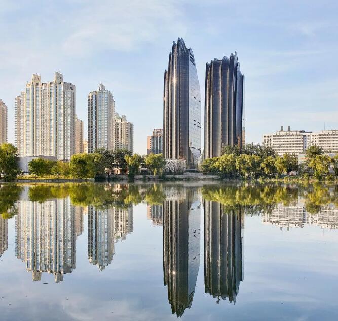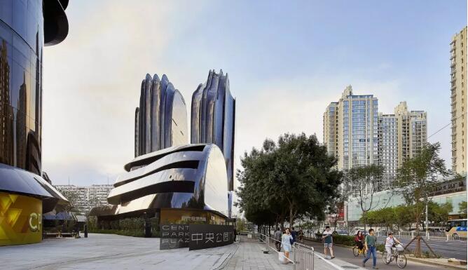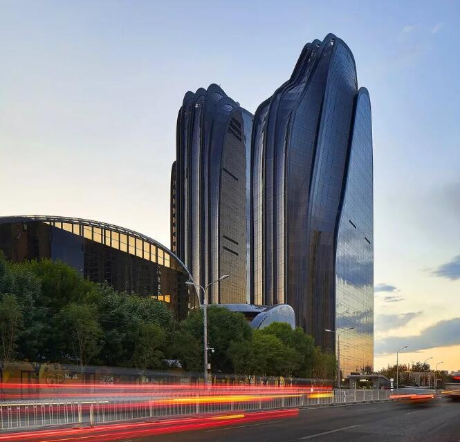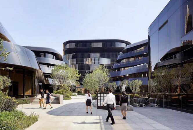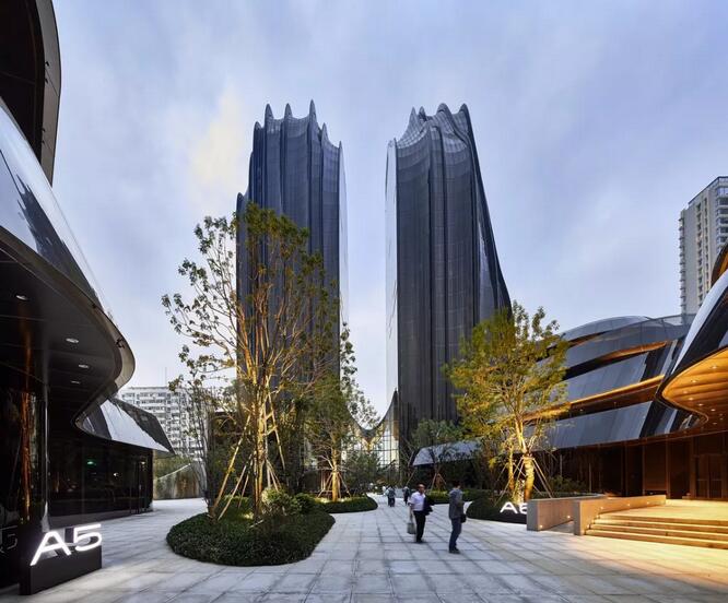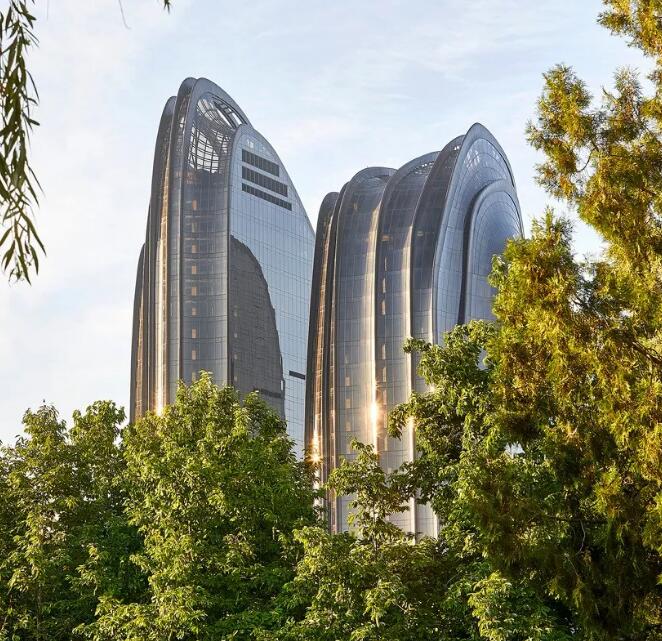 設(shè)計以中國山水藝術(shù)為靈感,在城市中心重塑大型的建筑關(guān)系,再現(xiàn)了“峰、澗、溪、石、谷、林”等自然形態(tài)和空間?;乇眰?cè)緊鄰公園湖面的不對稱雙塔辦公樓,像是兩座破土而出的山峰,挺拔于湖面之上。連接雙塔的中庭空間以拉索作為玻璃屋頂結(jié)構(gòu),通透明亮。