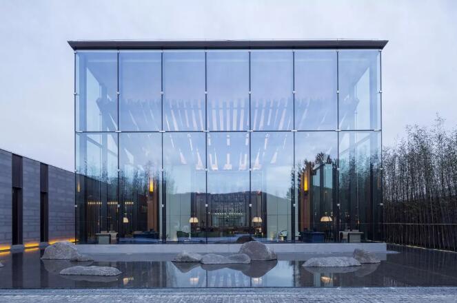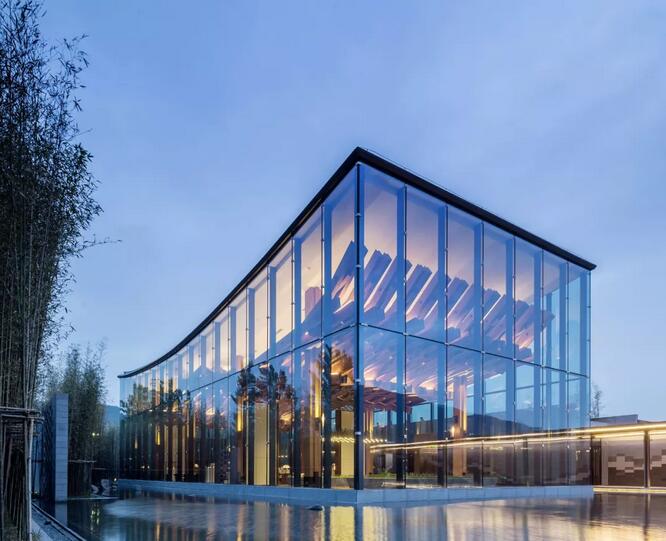 在建筑功能布置上,我們將入口門廳、放映室、獨(dú)立洽談及后勤等所有需要小尺度空間的功能壓縮到主體建筑東側(cè)的附樓中,從而在主體建筑內(nèi)部形成單一的大尺度展示空間。這樣的平面功能分布,不僅使主體建筑獲得最大的平面自由度,以適應(yīng)前期銷售展示和未來業(yè)主社區(qū)中心的多功能要求;而且通過全立面玻璃幕墻的設(shè)置,使得主體建筑的體積感被消解,內(nèi)部活動(dòng)得以最大限度的向城市展現(xiàn),建筑的公共屬性得到強(qiáng)化。