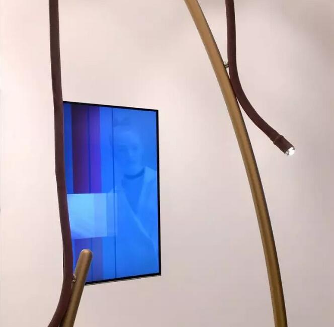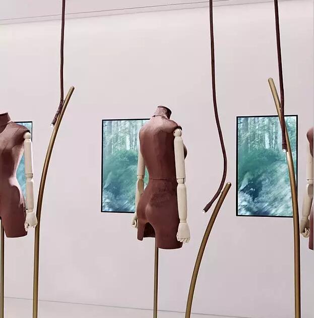 整個空間演變?yōu)橐粋€充滿原始?xì)庀⒌臓I地,北京裝賣店設(shè)計從入口出的手工編織物,到其后粗糲的不規(guī)則石墩,金屬的支架如同榕樹枝椏般的枝蔓,與從頂上懸掛的用暗紅麂皮絨包裹的“長辮子“燈具用吸鐵石固定相互支撐,可隨意扭動改變形態(tài)。北京專賣店設(shè)計吊頂采用16米長陽光板拼裝,陽光板透出上層的環(huán)境光,近似彌漫的朦朧天光,營造出部落群居場所的氣息。