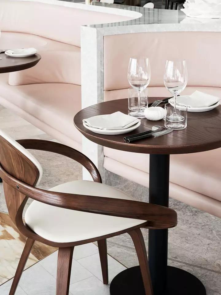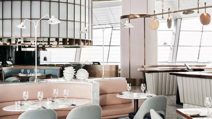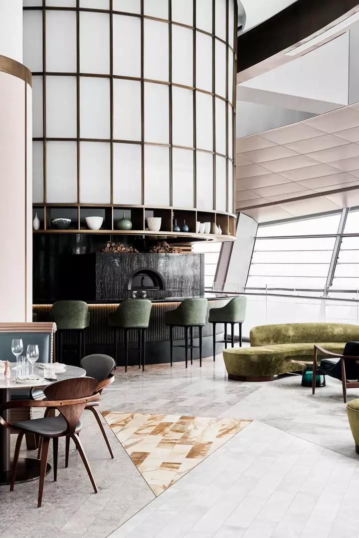 餐廳的設(shè)計(jì)從迪拜歌劇院和主廚對(duì)生蠔的熱愛(ài)中獲取靈感。在主餐廳里,一種粉色和奶油色的皮革和淺灰色的大理石色調(diào),類似生蠔內(nèi)部,而外圍則有一系列深色的灰色、綠色和黑色的色調(diào),讓人想起生蠔殼風(fēng)化紋理。貼著瓷磚的拱形天花板類似海上的波浪,加強(qiáng)了海洋主題的設(shè)計(jì)理念,手工制作的藍(lán)色羊毛地毯,是Alexander & Co特別設(shè)計(jì)來(lái)模擬海洋水域。