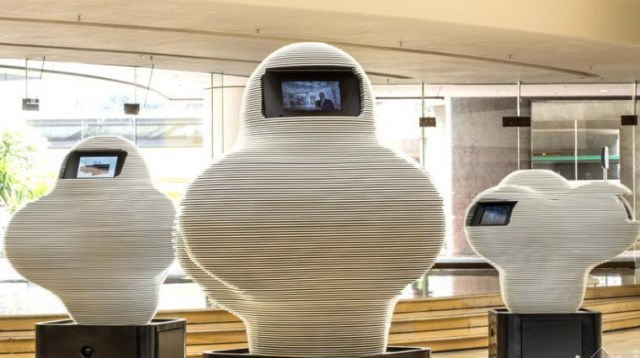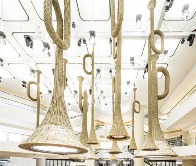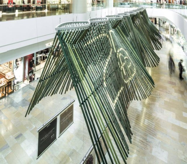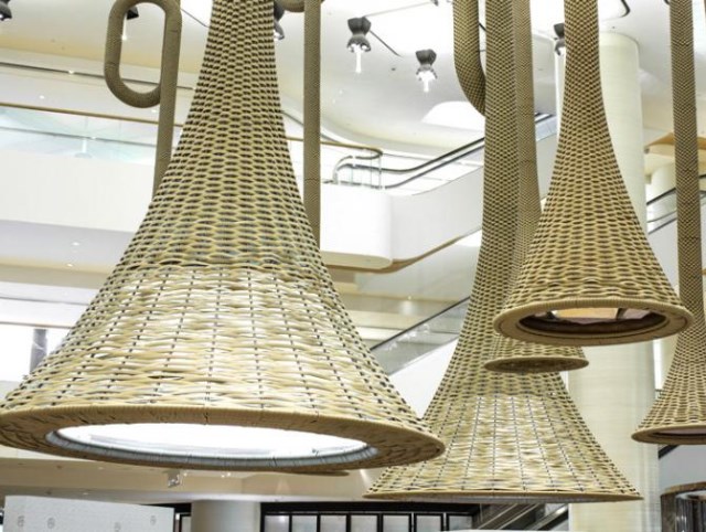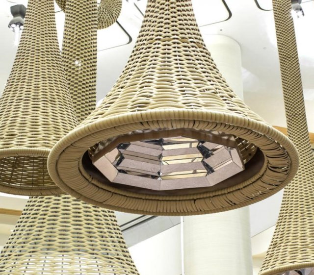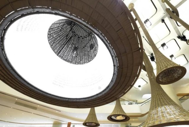 “this is OUR place”以懸掛在中庭天花板上的成對(duì)的大型音樂號(hào)角為特征,懸在空中的樂器是由柳條編織而成,與青銅金屬表面形成溫暖的氣氛。裝上多媒體之后,人們還能沉浸在3個(gè)大號(hào)角的360°全景下。