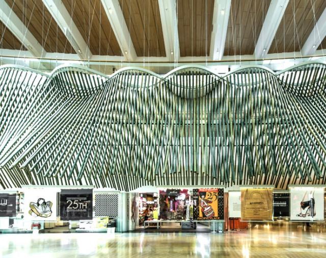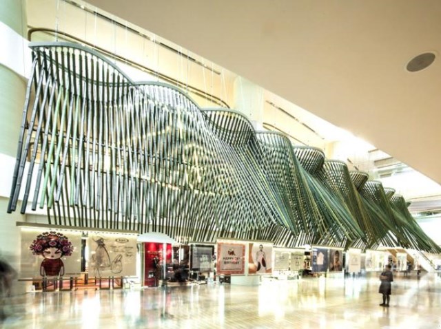 廣場(chǎng)的長(zhǎng)走廊是“Hall of Fame”,用現(xiàn)代的鋼架結(jié)構(gòu),靈感來(lái)源于中國(guó)傳統(tǒng)的錄音方法。鋼架結(jié)構(gòu)下懸掛的原生竹子以及纖維玻璃創(chuàng)造一個(gè)彎曲的絲狀的表面。