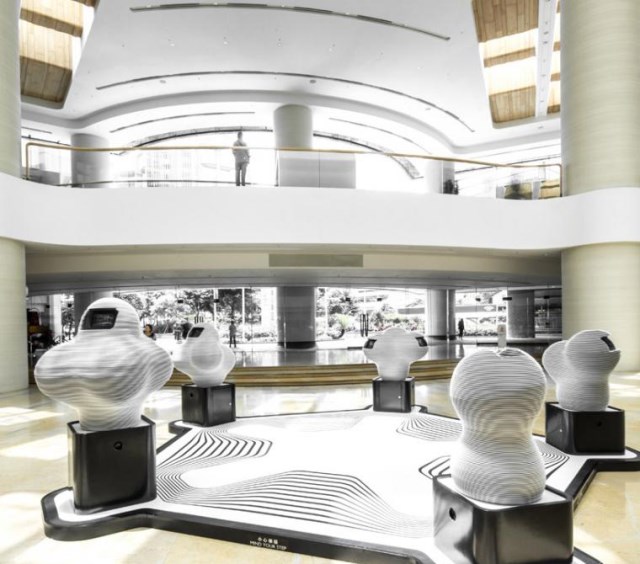 “Now and Then”位于第一層的中心,由五個(gè)不同的雕塑組成,每個(gè)坐立在盆里,就好像植物一樣,代表了生命和成長(zhǎng)。用五角形布置,并且用厚薄的白色線條連接,球根形狀代表著太古廣場(chǎng)的歷史和改變。