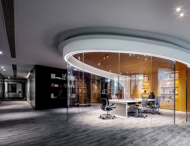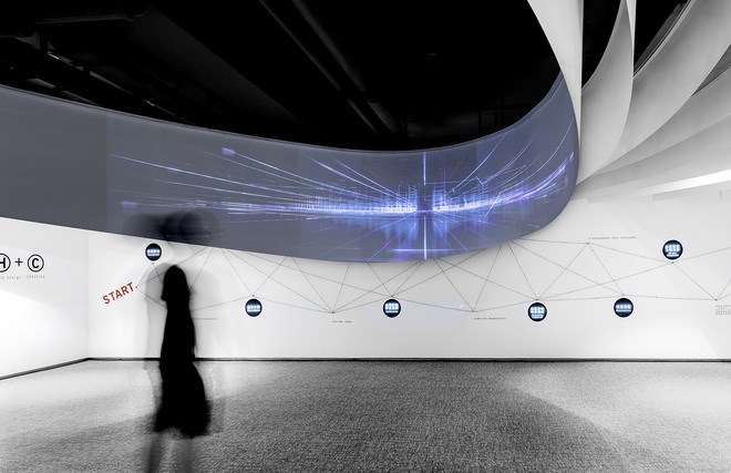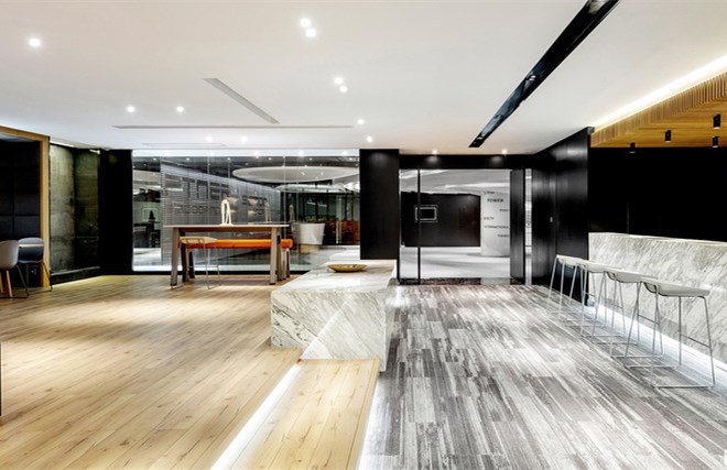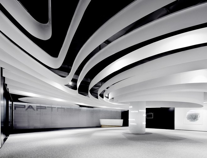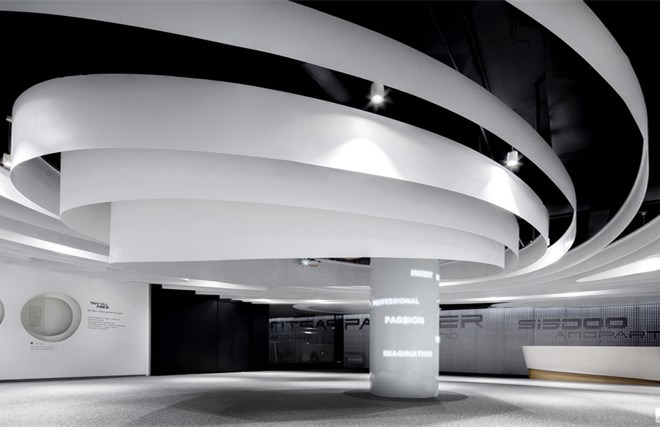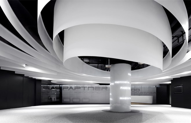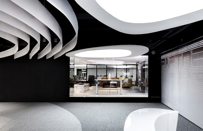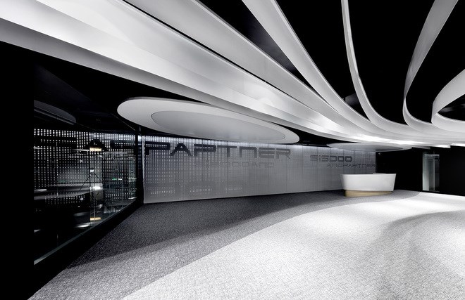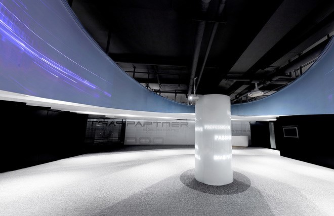 智能化燈光變幻,環(huán)繞式視頻投影,加強了空間的未來感與科技感。這里既是前臺區(qū)也是展覽空間。減去多余的裝飾,在設(shè)計上,峻佳化繁為簡,創(chuàng)造一個純粹神秘的空間,展示著一個品牌的未來想象力。辦公室與展廳的多重變奏,空間既要獨立而連貫又互不干擾,由超前未來區(qū)到專業(yè)辦公功能展示區(qū),這是設(shè)計的一次變奏。