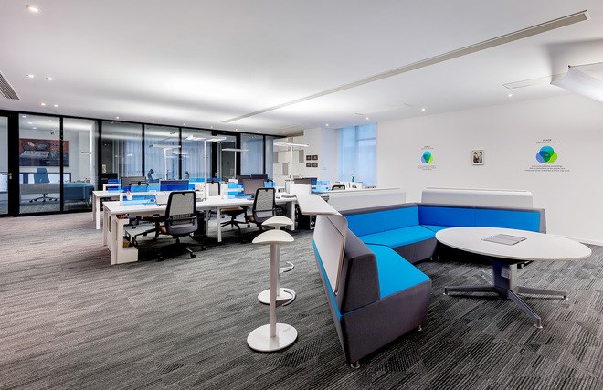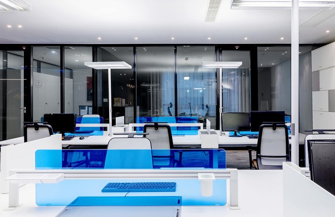 別致的會議室宛如飛船艙室,透明材質(zhì)營造空間的通透感。動線布局則是室內(nèi)設(shè)計的關(guān)鍵,隔而不斷,移步換景??紤]到使用的便利性,將其置中于員工區(qū),平衡了功能使用與場景亮點。在設(shè)計中,色彩、裝飾等不同元素產(chǎn)生多樣化的審美體驗。經(jīng)驗豐富的設(shè)計師擅長用顏色帶領(lǐng)情緒。過渡區(qū)鮮艷的色彩令人愉悅充滿靈感,白色和藍色的搭配則顯得簡潔明凈,讓人能夠安心思考。設(shè)計、空間與家具之間的相互搭配,是辦公室設(shè)計的關(guān)鍵。