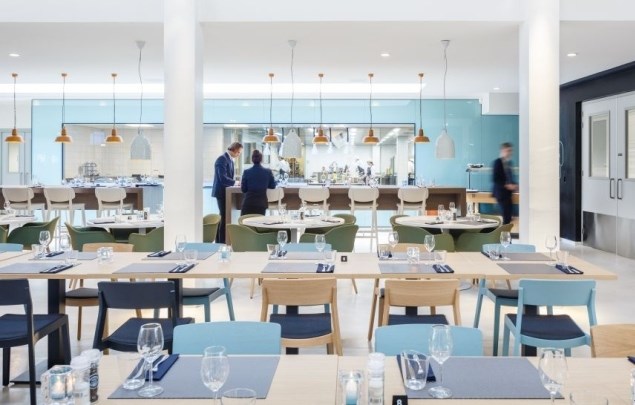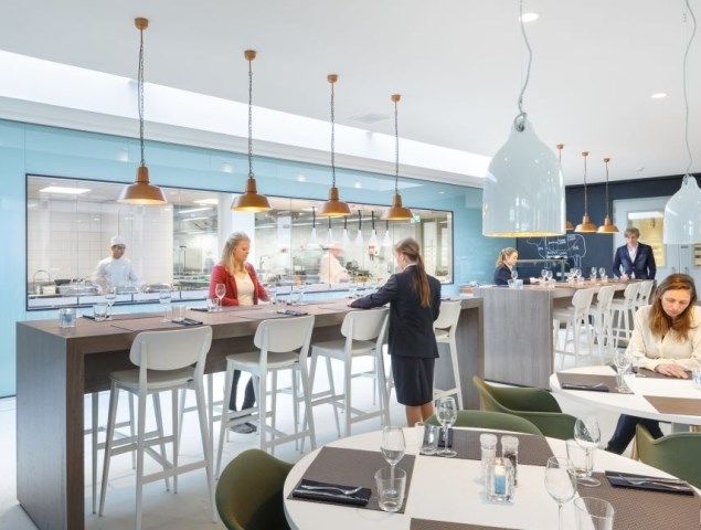 Fokkema & Partners設(shè)計(jì)的這個(gè)校園,為學(xué)生們提供了一個(gè)設(shè)施齊全光線明亮的學(xué)習(xí)環(huán)境,讓他們可以在充滿活力的地方盡情的學(xué)習(xí)知識(shí)鍛煉本領(lǐng)。在中央大廳一層咖啡館的周?chē)?,有一些就餐用的小包廂。這些包廂都具有不同的風(fēng)格和獨(dú)特之處,共同之處是無(wú)論是從哪個(gè)包廂里,都能看到食物準(zhǔn)備室里的一切活動(dòng)。入口處的遮陽(yáng)篷,更是讓那個(gè)大大的咖啡館顯得更有特點(diǎn)。