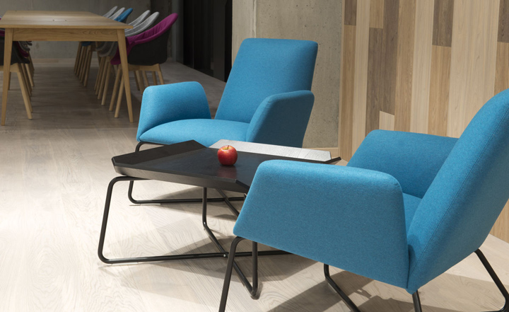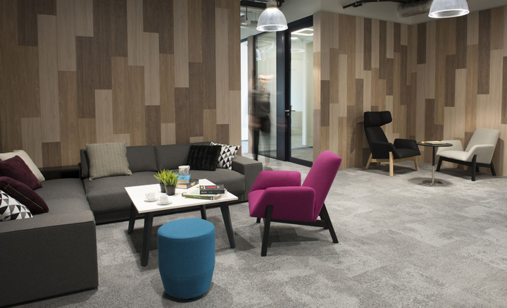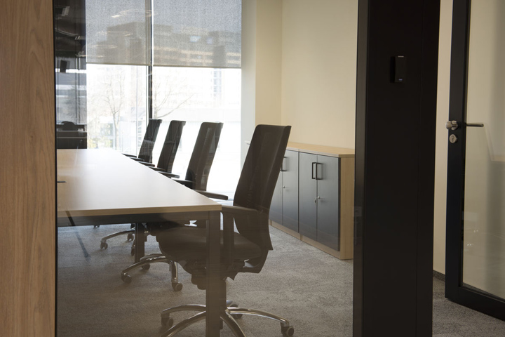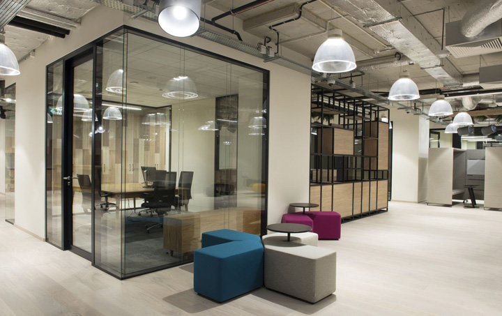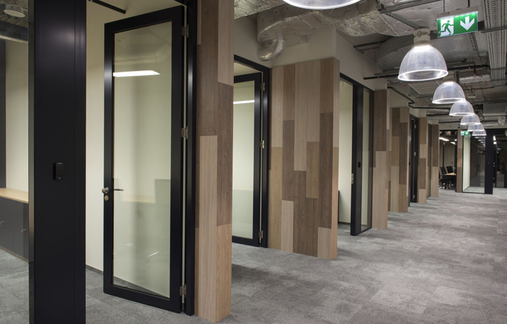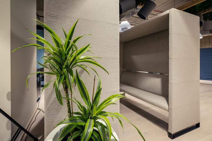 開放空間和輔助空間(文印室、茶水區(qū)、付費(fèi)電話會(huì)議室、電話亭等)圍繞一處大型開放的廚房咖吧而設(shè)。黑色方管制作的展示架兼具實(shí)用和裝飾性,帶來強(qiáng)烈的工業(yè)美學(xué)特征。