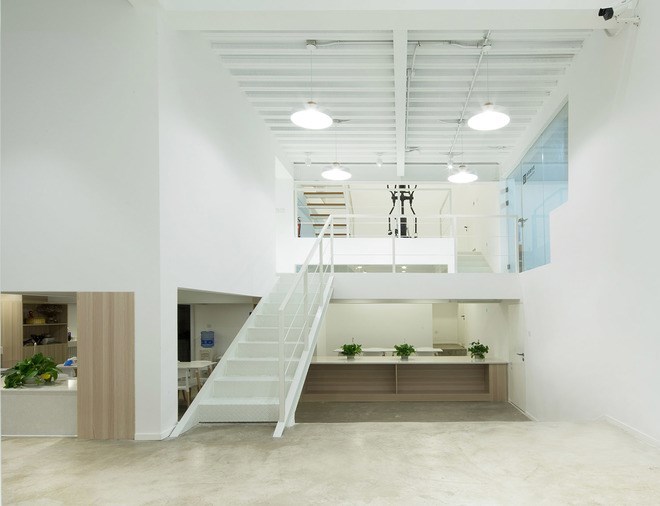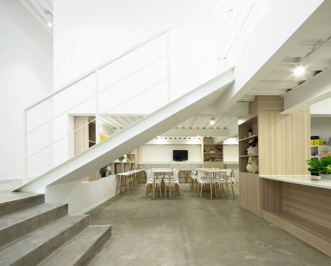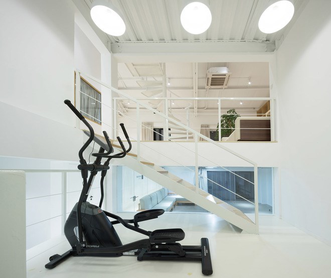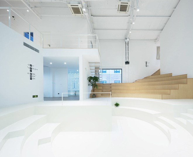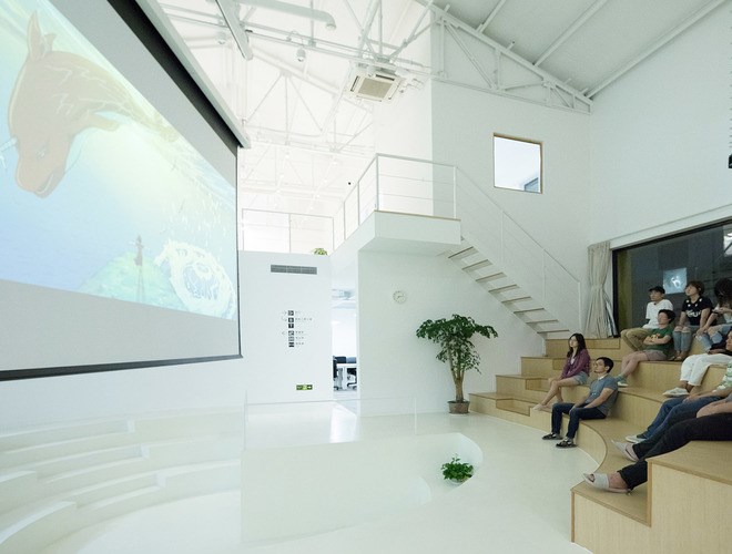 整個(gè)設(shè)計(jì)在保留長(zhǎng)方形廠房的基礎(chǔ)上,建筑室內(nèi)空間輪廓放棄了長(zhǎng)方形的限制,建筑室內(nèi)標(biāo)高也不再是單一水平,而是功能的分化設(shè)置不同區(qū)域的標(biāo)高,通過(guò)室內(nèi)階梯與坡道相互連接。廠房東邊做了兩層標(biāo)高,一層入口區(qū)為形象宣傳,臨近南立面是一個(gè)長(zhǎng)廊,一半作為電影海報(bào)展示,另外一半為微縮景觀。外墻鏤空花磚形式,陽(yáng)光透過(guò)外墻照射到展示長(zhǎng)廊。二層為獨(dú)立創(chuàng)作空間與兩個(gè)創(chuàng)始人工作室。廠房西邊利用層高做了多個(gè)標(biāo)高,從一至四層以及之間的夾層與錯(cuò)層空間,容納了開(kāi)敞通透的圖書室,封閉的觀影室,健身房、淋浴室、半地下(負(fù)一米)廚房、聚餐和party空間,也有加班可以休息的睡眠空間。