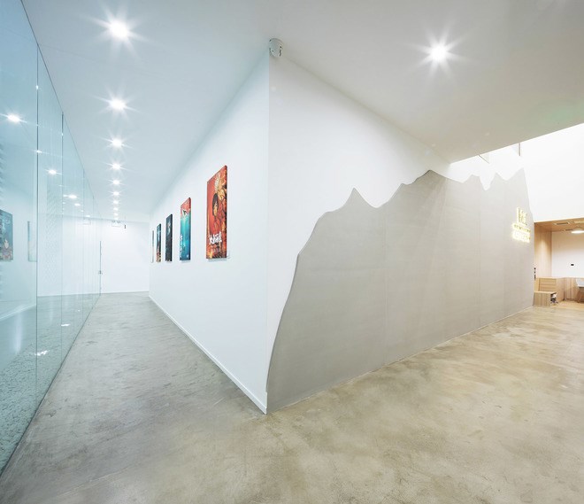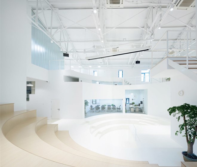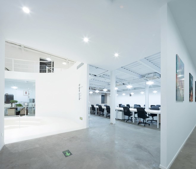 彼岸天總部辦公室位于吉里(北京)國(guó)際藝術(shù)區(qū),其成名作中國(guó)動(dòng)畫電影《大魚海棠》2017年于第15屆布達(dá)佩斯國(guó)際動(dòng)畫電影節(jié)斬獲最佳動(dòng)畫片。吉里(北京)國(guó)際藝術(shù)區(qū)內(nèi)聚集了各類影視產(chǎn)業(yè)企業(yè),大魚海棠的新辦公空間選定在9米層高的一座老廠房?jī)?nèi)。新空間保留了老廠房的屋架和外立面的圍護(hù)結(jié)構(gòu),在保持老廠房記憶的同時(shí),重新設(shè)計(jì)了部分辦公空間的外墻,以及全部門窗和基礎(chǔ),植入新的鋼結(jié)構(gòu)進(jìn)行功能體塊分割,達(dá)到新與舊的共融和碰撞。整個(gè)園區(qū)是灰蒙蒙的老廠房,而新空間外墻選用白色基調(diào)一直延伸到室內(nèi),搭配部分木材質(zhì)感,給予通透和純凈的感受。