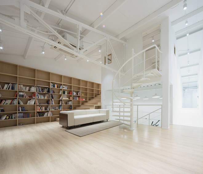 整個(gè)廠房建筑層高利用達(dá)到極致,并且外立面開(kāi)窗和室內(nèi)功能相互對(duì)應(yīng)。整個(gè)立面的開(kāi)窗對(duì)應(yīng)室內(nèi)不同的標(biāo)高空間,將建筑內(nèi)部的活動(dòng)與功能映射到建筑外表之上,晚上從墻外看到的是室內(nèi)是帶有場(chǎng)景化的節(jié)奏感。整個(gè)空間節(jié)奏張弛有度,從極其開(kāi)敞的中庭空間到極其有圍合感的影音室,再到半開(kāi)敞的圖書閱讀空間,在這個(gè)新的建筑里電影人既能通過(guò)各種路徑到達(dá)屬于所有人的集體空間,又能尋找到屬于自己的獨(dú)立小天地,讓工作室變成一個(gè)具有場(chǎng)景敘事感的空間舞臺(tái)。