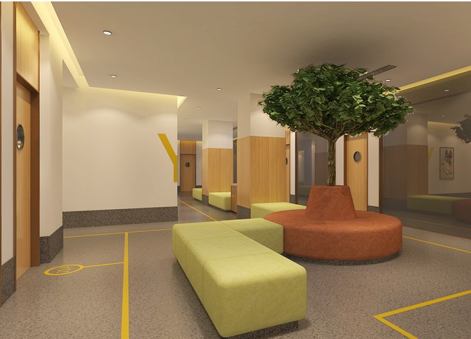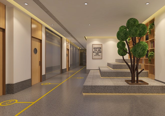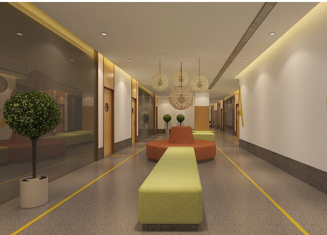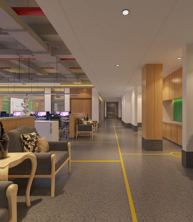 吊頂上的凹槽線條,以及與墻之間的燈帶,是簡約而不簡單的最好詮釋?;疑苣z地板上的黃色地標(biāo),既豐富地面的變化,又起著劃分區(qū)域和指引路線的作用。