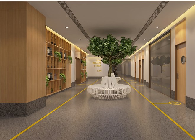 門、柱、書柜采用同一種顏色的木紋飾面板,整個(gè)空間整齊劃一。過道中間的小樹為人們帶來一絲綠色,白色鐵藝座椅圍樹而繞,坐在綠蔭下,捧起一本書,細(xì)品每一字、每一句。