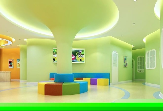 大多數(shù)孩子比較喜歡的顏色。該設(shè)計(jì)中心的區(qū)域區(qū)分明顯,有不同的裝飾風(fēng)格。有著模擬宇宙的神秘的房間,也有著貼近但自然可以看到藍(lán)天白云的房間。