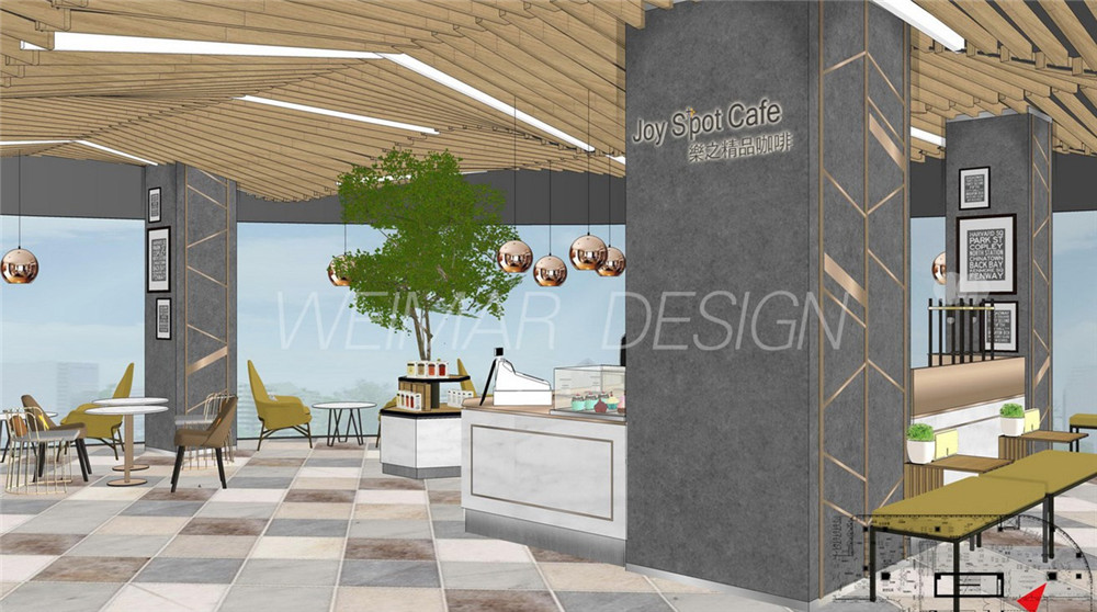 本方案是以音樂的旋律感為設計主題,整個咖啡廳設計中運用了波浪形的線形來體現(xiàn)旋律感,大堂吊頂用大面積的波浪形木條做造型,蜿蜒起伏,既有旋律感也略帶有一絲動感。