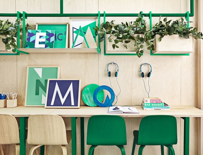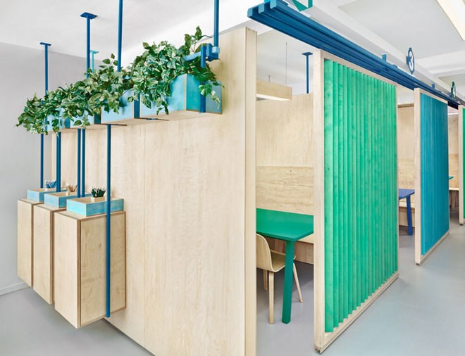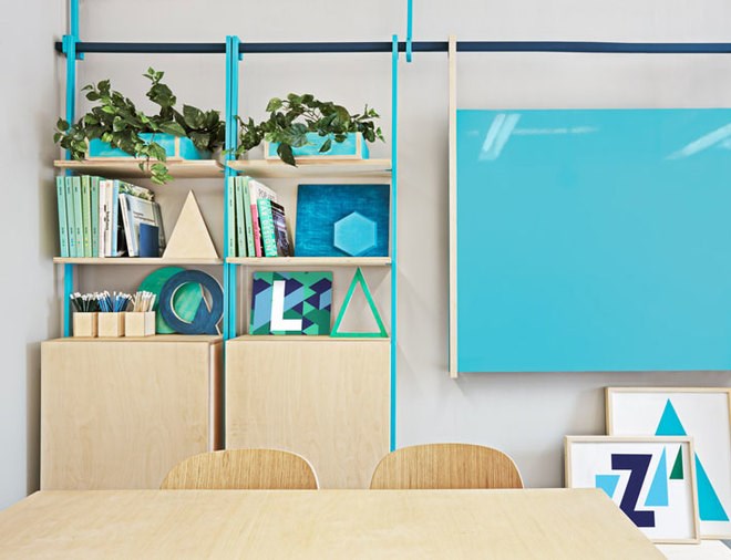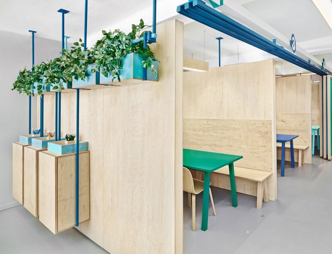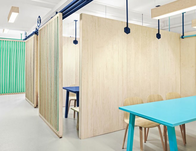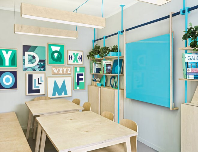 該學(xué)校主要為青少年與年輕人提供英語教育,為此空間設(shè)計使用了明亮歡快但是不乏沉穩(wěn)的色彩與設(shè)計風(fēng)格。空間家具與隔墻多采用膠合板設(shè)計。