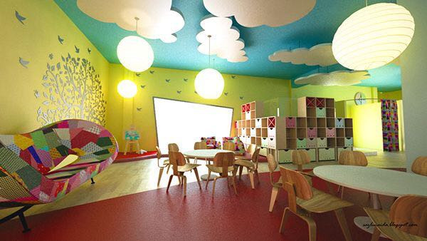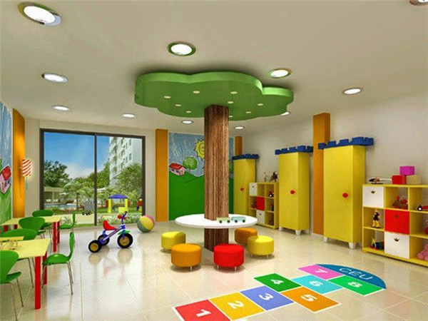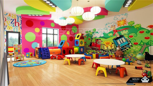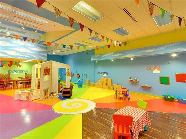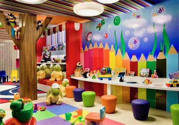 本案設(shè)計元素來源于七彩虹,整個空間以七彩為設(shè)計思路。幼兒天生就對顏色鮮艷的事物感興趣。那么,大千世界有些什么顏色呢?