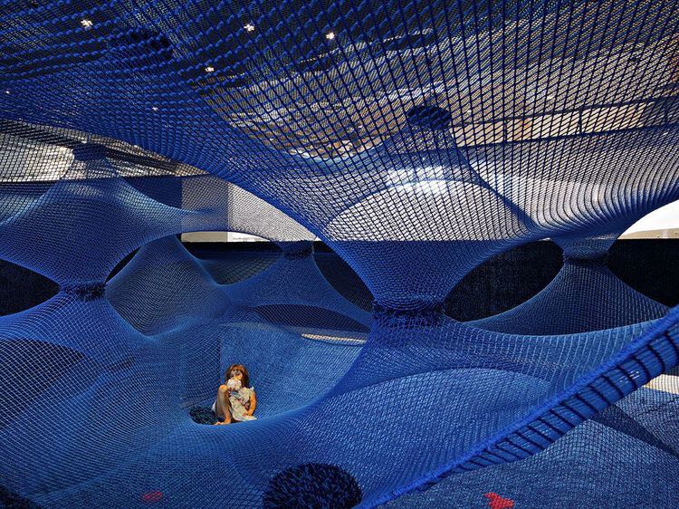 彩色攀爬網(wǎng)的偏心荷載和高懸掛點(diǎn),需要設(shè)計(jì)一個(gè)堅(jiān)固的支撐結(jié)構(gòu)。半透明的攀爬網(wǎng),看起來(lái)像在空中漂浮,他們的彈性為所有的孩子提供了一個(gè)安全的玩??臻g,這個(gè)攀爬網(wǎng)拉長(zhǎng)和收縮自然,像一個(gè)生物體,經(jīng)常以一種意想不到的方式吸收以及釋放能量。