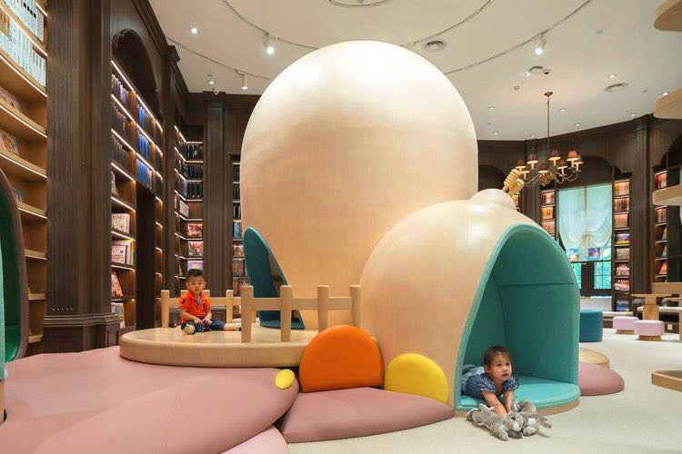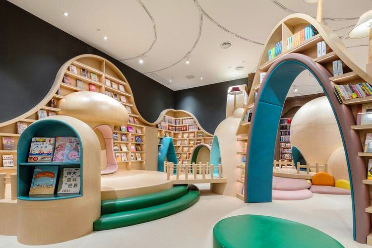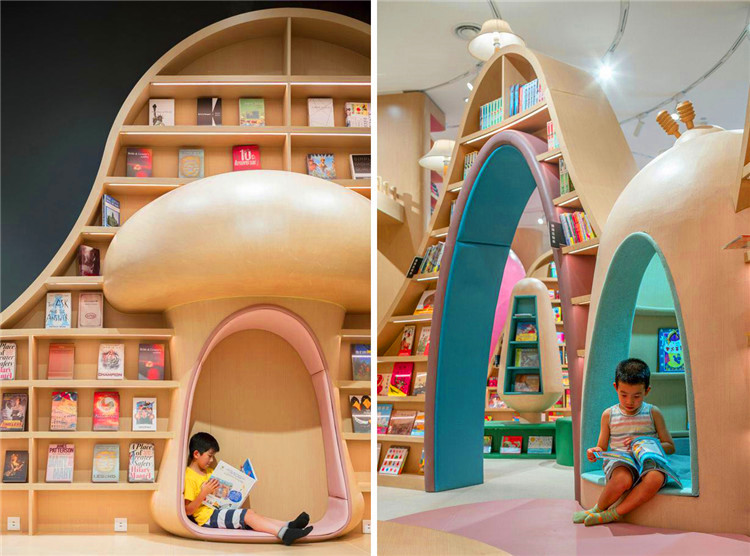 本案設(shè)計(jì)思路來源與卡通蘑菇屋,用蘑菇的外形輪廓制作書架以及閱讀區(qū)座位,給孩子們創(chuàng)造生動(dòng)活剝活波的就讀空間,整個(gè)設(shè)計(jì)都沒有設(shè)置可移動(dòng)的家具,在書架邊緣以及就坐區(qū)均采用軟包處理,以保證孩子在自由閱讀時(shí)的安全問題。