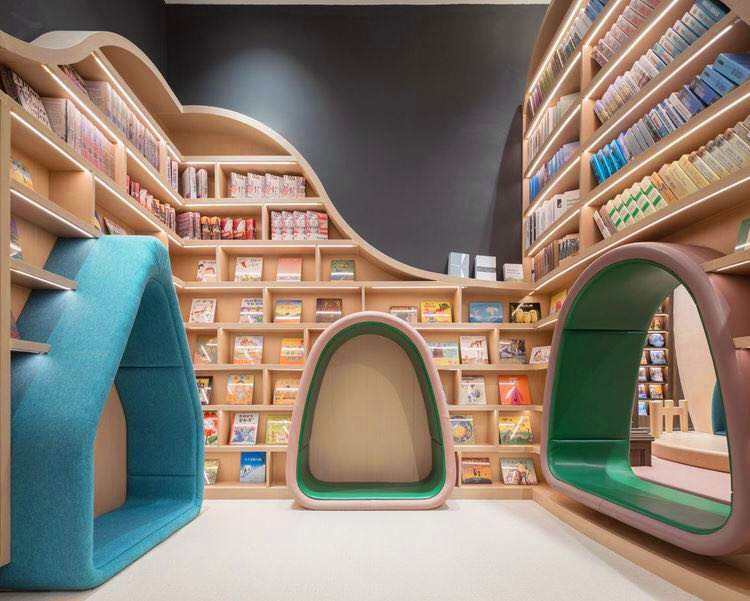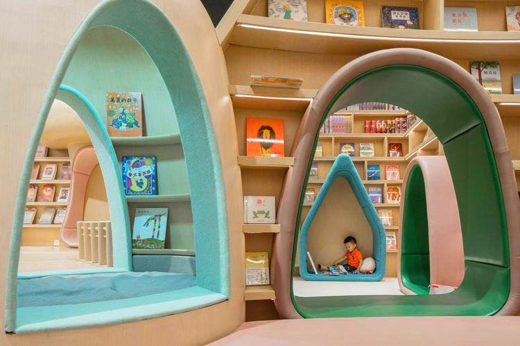 書架與書架之間都可以互通。在這個(gè)空間里孩子們充分發(fā)揮想象力,在閱讀的時(shí)候可以隨意穿行,隨意在就讀區(qū)閱讀。