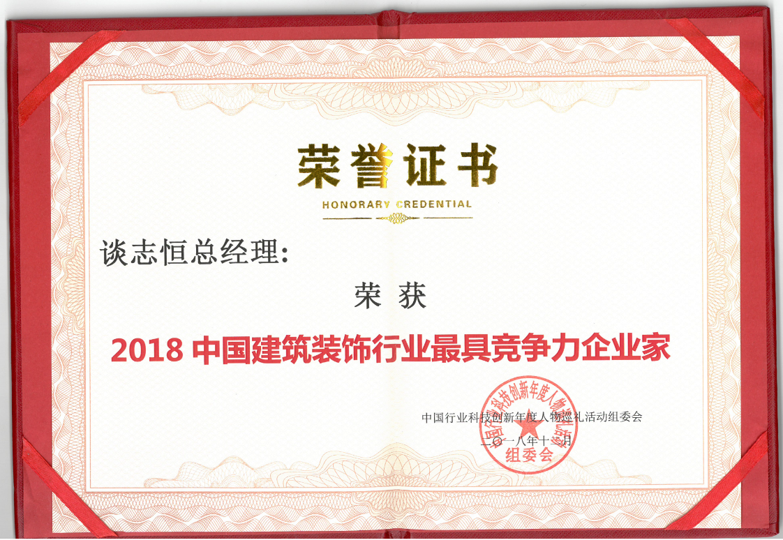 英特威迅總經(jīng)理談志恒先生榮獲:建筑裝飾行業(yè)最具競爭力企業(yè)家。