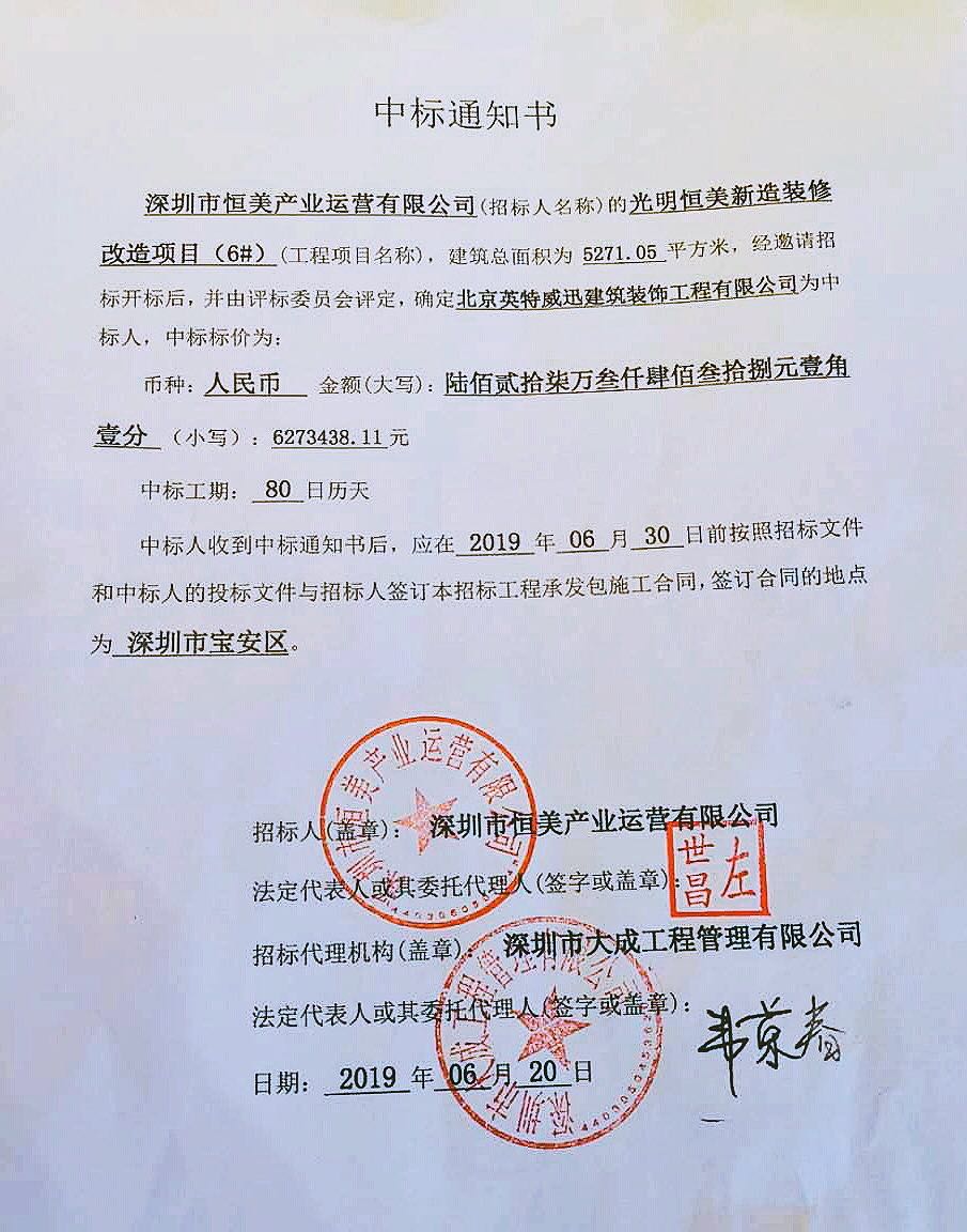 賀我公司中標(biāo)深圳恒美產(chǎn)業(yè)運(yùn)營有限公司的光明恒美新造裝修改造項(xiàng)目,該項(xiàng)目建筑面積為5271.05㎡,經(jīng)邀請招標(biāo)開標(biāo)后,并由評標(biāo)委員會(huì)評定,確定北京英特威迅建筑裝飾工程有限公司為中標(biāo)人。