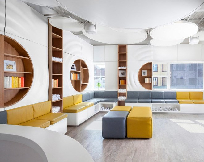 幼兒園的核心是其交通空間,寬敞的樓梯被一個畫廊環(huán)繞,雨傘狀的錐形天窗提供了人工和自然光。