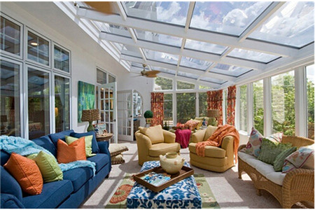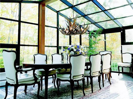 陽光房裝修設計方案4、如果是需要傳統(tǒng)建筑功能(如:特色客廳、書房、活動室等)的陽光房,宜選擇鋼化中空玻璃屋頂,并配有適量專用中空玻璃天窗,以斷橋鋁中空玻璃窗或鋁木復合中空玻璃窗作周邊維護的產品。在使用時還需配備專用遮陽簾、遮陽棚、隱形紗窗等產品。如果追求最新時尚且預算充裕的話,可挑選最新高科技的調光玻璃作為陽光房的玻璃,可遙控調節(jié)玻璃的透明與不透明,綠色節(jié)能的同時,完全保護隱私。