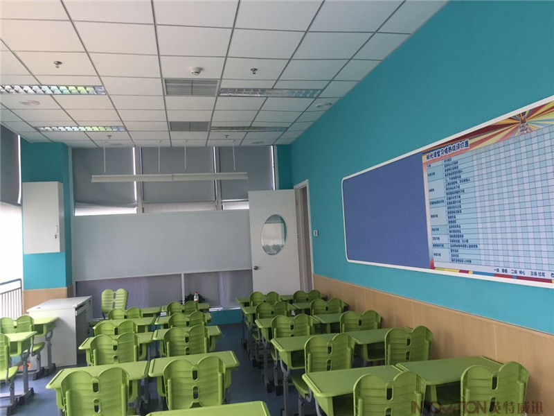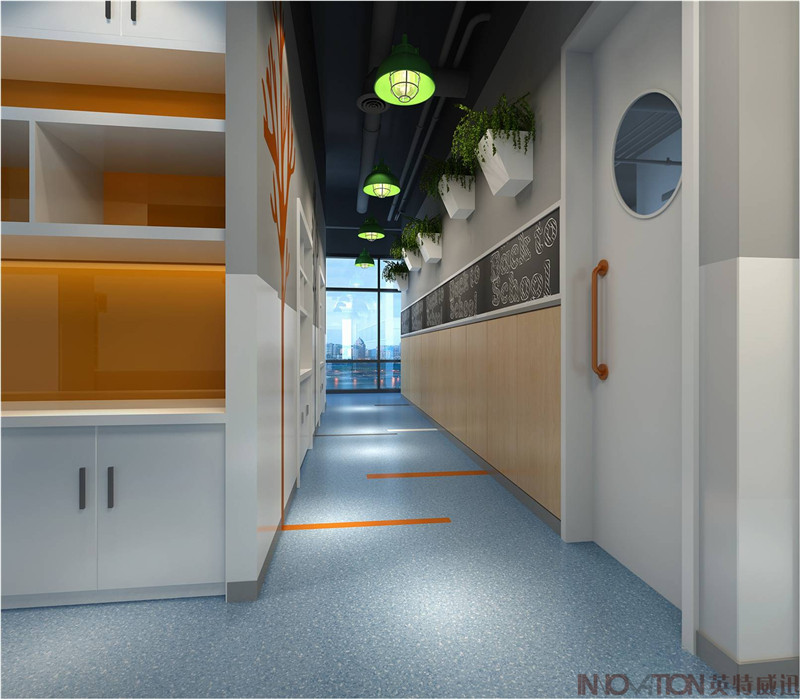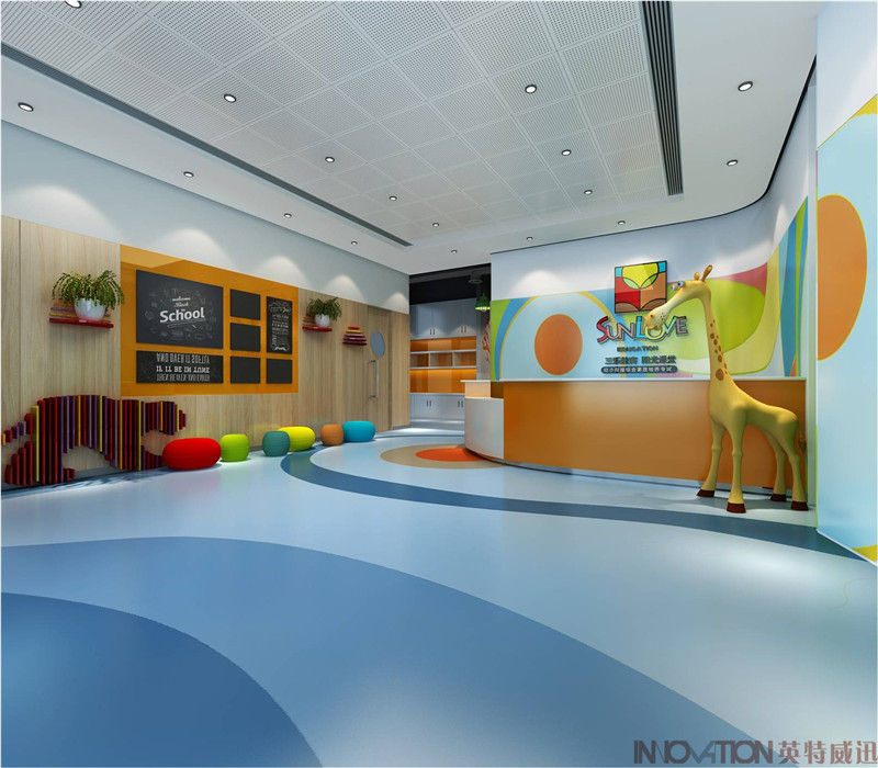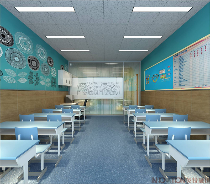 教室設(shè)計以藍色背景墻面為基礎(chǔ),和室內(nèi)課桌的藍色相呼應(yīng),給人一種藍色海洋的清爽感覺。墻面圖案樣式多樣,顏色豐富,突出圖案的多樣性和多變性。