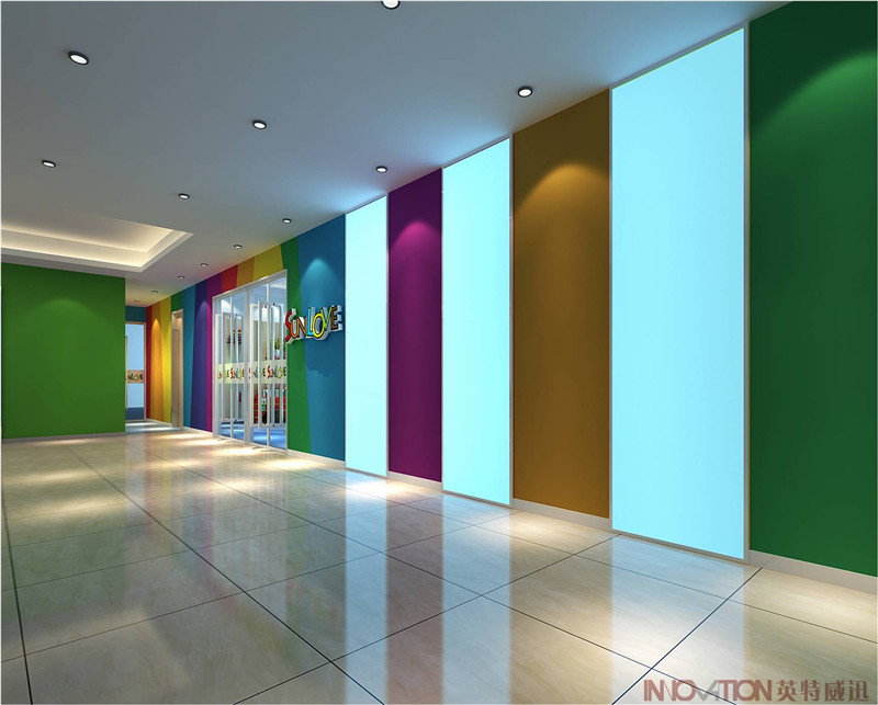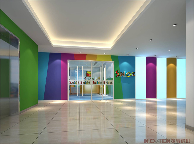 進入大廳,首先映入眼簾的是入口門廳和logo墻,設(shè)計中大膽使用色彩鮮明的跳躍性線條,更好的體現(xiàn)個性化教學(xué)的特色。