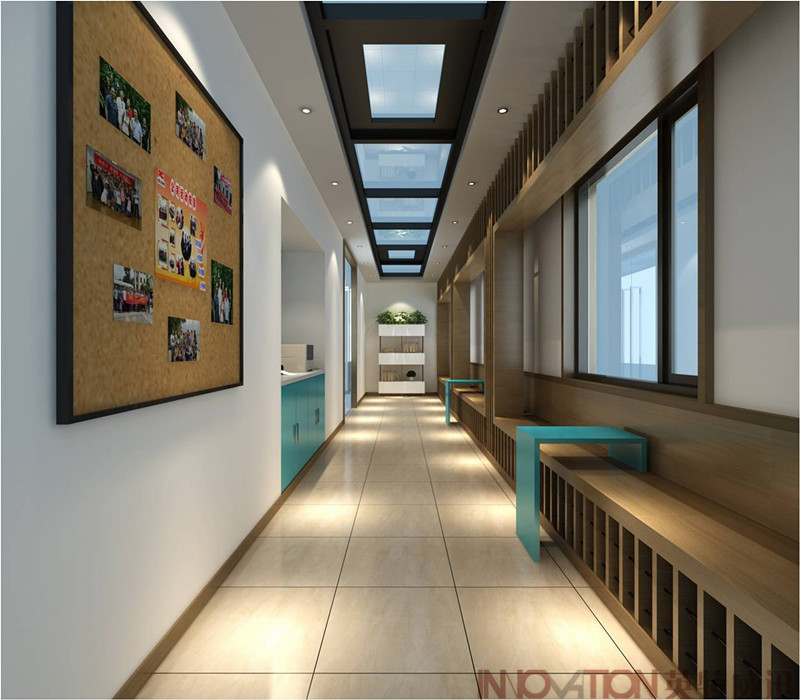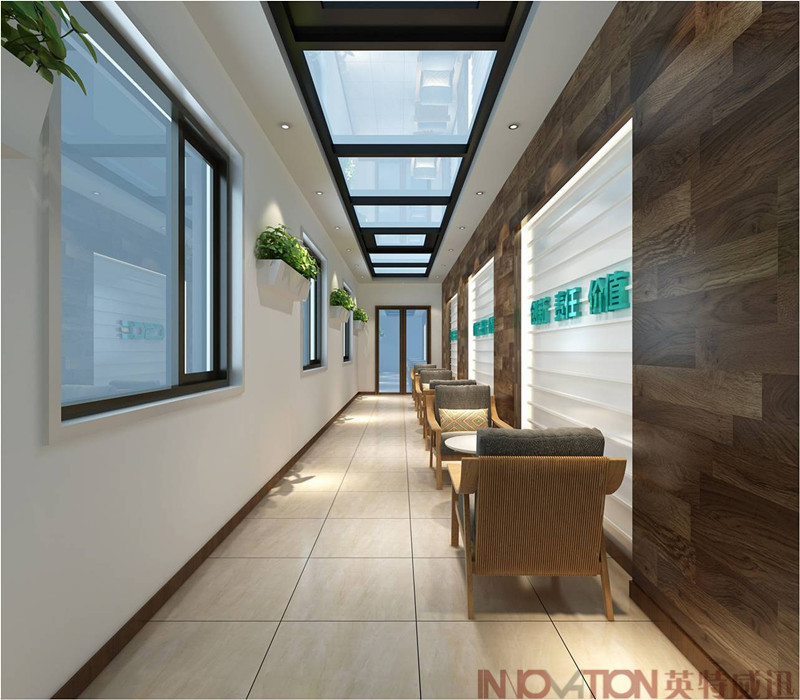 本案采用木質(zhì)的材質(zhì)與植物墻為載體體現(xiàn)公司的清潔能源的性質(zhì),木質(zhì)的天然紋理與生機(jī)勃勃的植物。入口側(cè)墻的多媒體電視滾動(dòng)播放公司的電子資料,讓訪客能盡快了解公司的狀況及未來的發(fā)展方向。白色烤漆造型與灰綠色背漆玻璃營造的時(shí)尚簡潔的公司展廳進(jìn)一步解析公司取得的成就。