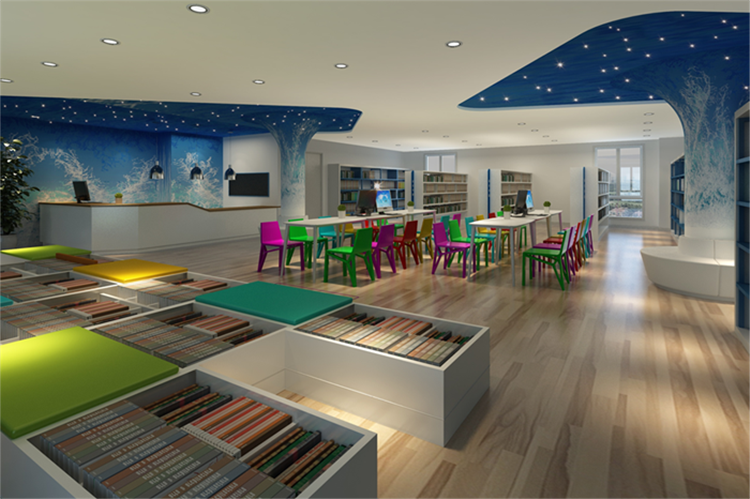 閱讀區(qū)和公共活動區(qū)以家庭式的溫馨風(fēng)格為主,不使用座椅,代之以舒適便捷的懶人沙發(fā),教師辦公區(qū)也被設(shè)計為一個可供多人討論交流的區(qū)域,同時又保障了教師的辦公需要。