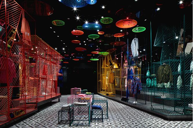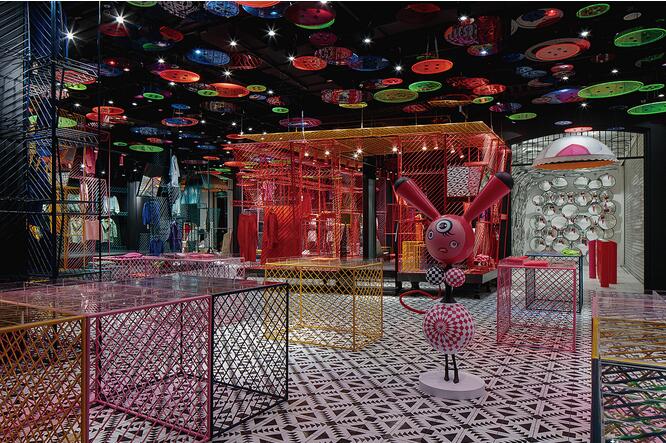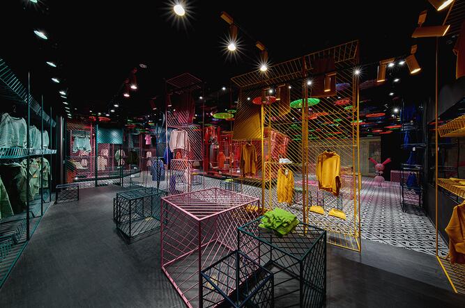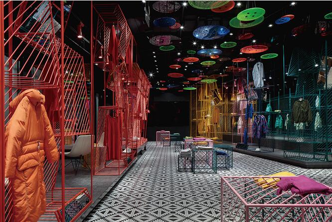 潮女區(qū)大色塊的撞色,由一根根鐵藝曲折而成的彩色貨架,在這個強(qiáng)調(diào)個性的空間,利用衣架的前后折度來分割成雙面掛衣的結(jié)構(gòu),彩色與折線的拼織來打造幻彩個性的空間已來呼應(yīng)該空間里服裝展現(xiàn)的個性。