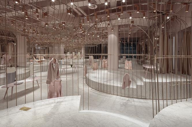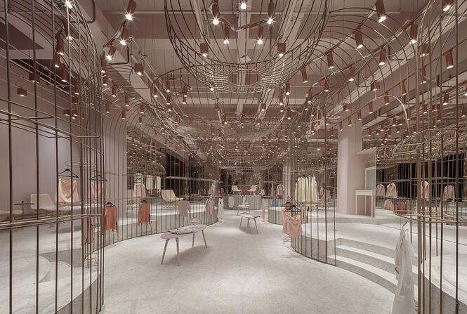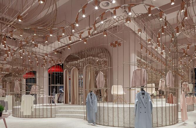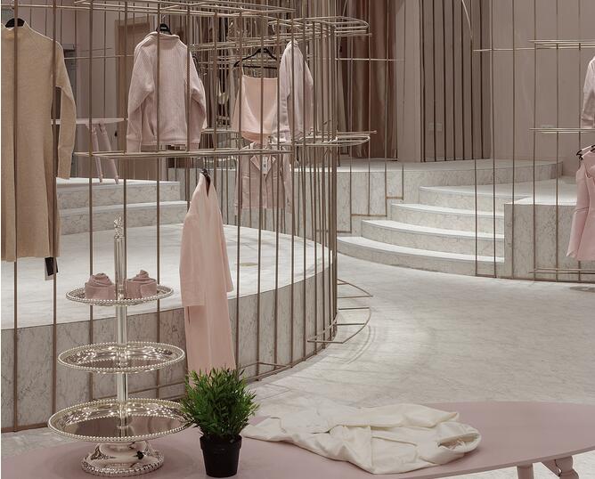 名媛區(qū),一個個精致的金絲籠,衣架被放在金絲籠內(nèi)外兩側(cè),遠(yuǎn)看仿若被精心呵護(hù)的公主蓬蓬裙。高低起伏的弧形平臺,增加趣味性的同時又不失活潑可愛。試衣間被巧妙的隱藏在弧形鏡面的“蓬蓬裙”內(nèi)側(cè)。同時每個試衣間區(qū)域也提供梳妝、休憩、自拍區(qū),等待著每一位公主。