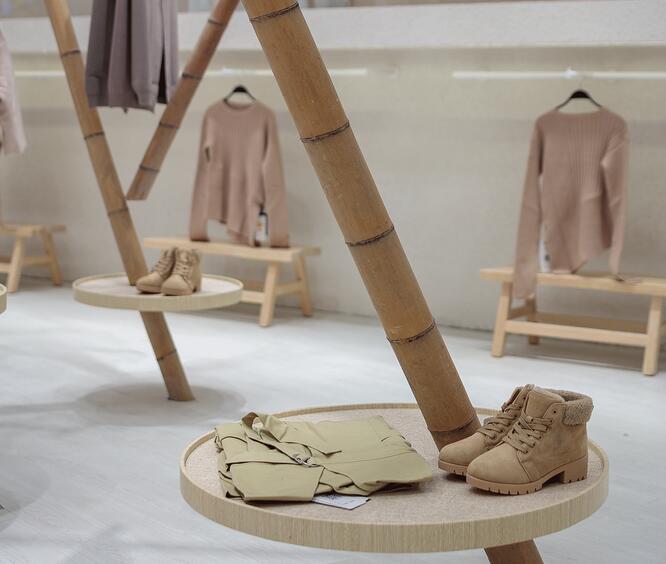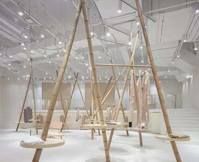 通過主入口區(qū)大大的門拱,進(jìn)入到森女區(qū)。乳白色肌理墻面,白色地面,一個潔白干凈的空間,支立著一根根竹竿并以麻繩做連接,而衣架也就此成型。穿衣鏡則隱藏在兩根竹竿的夾角立面上??臻g明亮簡潔并用古樸的材料來呼應(yīng)該空間衣服類型的氣質(zhì)。