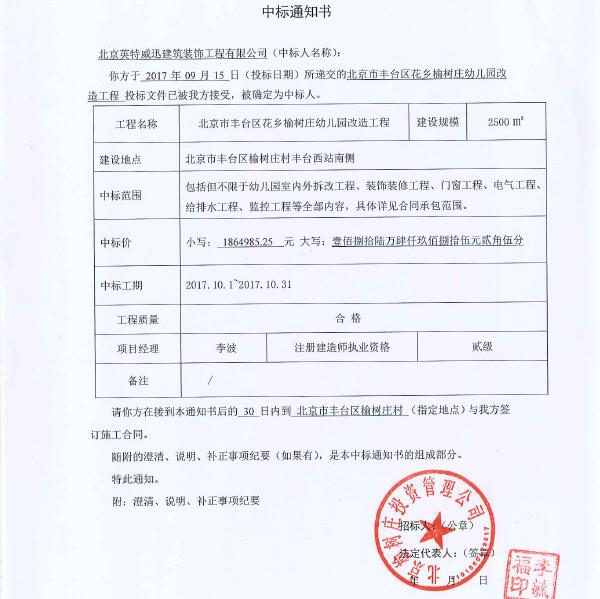 北京英特威迅建筑裝飾工程有限公司于2017年09月15日所遞交的北京市豐臺(tái)區(qū)花鄉(xiāng)榆樹莊幼兒園改造工程投標(biāo)文件已被我方接受,被確定為中標(biāo)人。