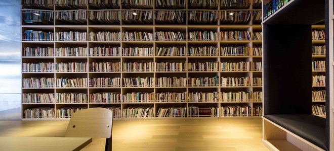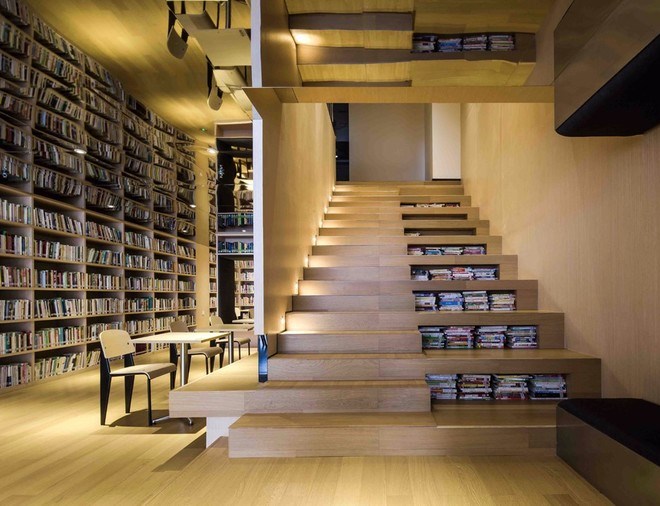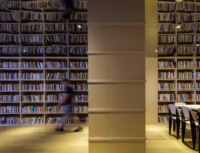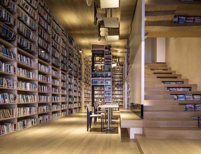 千百本書籍互相擠靠,忽左忽右傾斜排開,真真應(yīng)了那句古詩的景,千鐘粟在田野間隨風(fēng)蕩起。定睛看,此景又帶著虛幻,原是頂端不銹鋼材質(zhì)的清澈倒影虛實。間,不禁引人沉醉于書香字里行間。書吧是核心。人們被溫暖明亮的木材所包圍。環(huán)顧四周,有無數(shù)層架子,層層疊疊,如高聳入云。